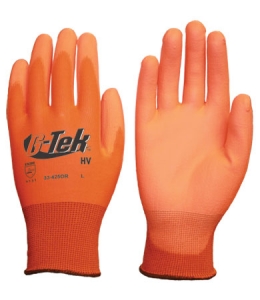 皮普®G-Tek®HV聚氨酯涂层13-gauge无缝针织hi-viz聚酯工作手套可与匹配的高可见橙色或高可见黄色聚氨酯涂层手掌和手指使这些令人敬畏的手信号交通或同事。聚氨酯提供良好的耐磨性和干抓地力,并在微湿条件下公平抓地力。PU特性允许一个非常薄的涂层,这导致了优异的触感和灵活性。舒适透气的背部和编织手腕有助于防止灰尘和碎片进入手套。硅胶是免费的。